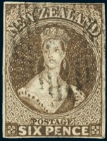 1864,IMPERF. 6d red-brown, (Davies print) NZ Wmk., SG 99, (CP A5f $3000). Full four margins, light postmark.
