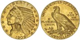 U.S.A., five dollars or half eagle, Indian head, 1909D. Nearly extremely fine.