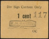 WORLD WAR II MILITARY CANTEEN CHIT, Div Sigs Canteen Only (Divisional Signals) one cent, No.117 OC, K.H. Barron (Officer Commanding) Light buff card (154 x ...