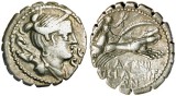 PUB. CREPUSIUS, (82 B.C.), silver denarius, Rome mint, (3.836 grams), obv. Apollo laureate head to right, sceptre over shoulder, T behind, symbol below chin, rev. ...