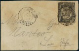 NEW CALEDONIA, 10 centimes black imperf. with four full margins (SG 1), fixed to envelope from Noumea in New Caledonia to Nantes Loire (France). Fine ...