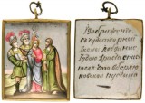 RUSSIA, late 19th Century icon, traditionally painted, depicting an old testament scene, with overlaid metal oklad, in later gilt frame, (11.5cm x 9cm).