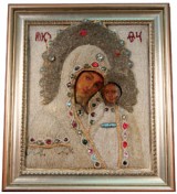 RUSSIA, late 19th century icon, traditionally painted, depicting Mother of God and Christ child, overlaid with elaborate oklad, composed of decorative beading and coloured stones, ...