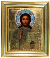 RUSSIA, late 19th century icon, traditionally painted, depicting Christ shown half length with right hand raised in blessing, with overlaid oklad, some enamelling, in a ...