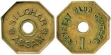 INDIA, Assam, Soldiers Club, tokens in brass, one shillong (octagonal 19mm), two shillong (octagonal 26mm), four shillong (22mm), obverse, around top, "Soldiers Club", at bottom, ...