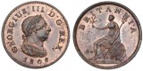 GEORGE III, fourth issue, penny, 1806, incuse hair curl (S.3780). Part mint red with some blue brown toning, nearly uncirculated.
