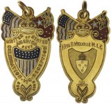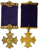 INDEPENDENT ORDER OF FORESTERS, 1902, in gold (15ct, 15.3gm) deeply engraved modified Maltese cross, loop mount, clasp, blur ribbon and brooch bar, obverse, elk within ...