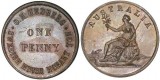 HEDBERG, O.H., Hobart, Australia seated pattern penny, undated (A.201). Die breaks under arm, underlying brilliance, nearly FDC and rare.
