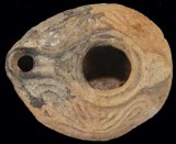 BYZANTINE POTTERY OIL LAMP, c.600-700, mould made of orange clay with oval body (88mm long, 72mm wide), with short tapering nozzle and short pointed handle, ...