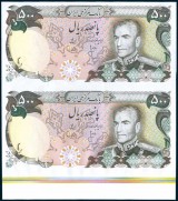 IRAN, Kingdom, Bank Markazi Iran, five hundred rials, undated (1974-1979) unissued uncut pair (P.104ar), bottom selvedge colour guides, written note on bottom back edge 'Smudge ...