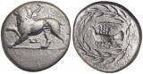 PELOPONNESOS, Sikyonia, Sikyon, (late 330's B.C.), silver stater, (11.37 gm), obv. chimaera to left, **SE* below, on ground line with right foreleg raised high, wreath ...