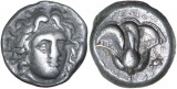 CARIAN ISLANDS, Rhodes, (360-late 340's B.C.), silver didrachm, (6.65 gm), obv. head of Helios three-quarter face to right with hair loose, rev. rose, with bud ...