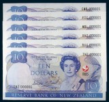 RESERVE BANK OF NEW ZEALAND, S.T.Russell, (1985-89), ten dollars, NJR 000742/6, a run of five consecutive first prefix notes (P.172b). Uncirculated, with low serial numbers. ...