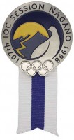 JAPAN, 107th IOC Session Nagano 1998, silvered blue and yellow enamel badge (47x45mm) with blue and white ribbon. In original plastic case, uncirculated.