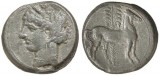 ZEUGITANIA, Punic Coinage, Carthage, (c.216-215 B.C.), billon tridrachm or one and a half shekel, (10.83 g), obv. small head of Tanit or Kore to left, ...