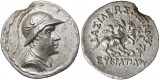BAKTRIA, Kingdom of, Eucratides I, (170-145 B.C.), silver tetradrachm, (16.73 gm), obv. pith helmeted head of Eucratides to right with dotted border ornamented with bull's ...
