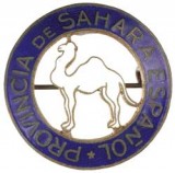 FRENCH PROTECTORATE OF MOROCCO, military badges, includes voided metal badge with white camel standing over a gilt crescent bearing name 'SAHARA' in blue; another voided ...