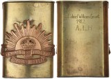 AUSTRALIAN TRENCH ART CIGARETTE CASE, made of brass (75x53mm), lift up top lid, with polished Rising Sun hat badge (KC) fitted to one side and ...