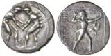 PAMPHYLIA, Aspendos, (370-330 B.C.), silver stater, (10.78 g), obv. two naked athletes as wrestlers grasping each other by the hands, KI between, rev. slinger advancing ...