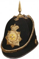 GREAT BRITAIN, Oxfordshire Volunteer Light Infantry enlisted ranks 1878 pattern Home Service helmet, a refurbished composite parts example, original blue cloth enlisted ranks helmet with ...