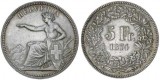 SWITZERLAND, Republic, silver one franc 1861B, 1910B, copper-nickel 1968B (KM.9a, 24, 24a.1). First toned, very fine, others brilliant uncirculated. (3)