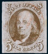 USA, 1847 (JULY 1), 5 cents red brown SG 1, Scott 1, on thin bluish wove paper, two very clear margins, two close margins, (CV ...