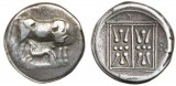 ILLYRIA, Epidamnos-Dyrrhachion (450-350 century B.C.), silver stater, (10.52 g), obv. cow standing right looking back at calf, which it suckles, rev. double floral pattern within ...