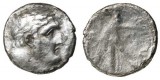 LYCAONIA, Laranda, (c.324/3 B.C.), silver obol, 10mm, (0.48 g), obv. Baaltars seated left, holding grain ear, grapes, and sceptre, rev. forepart of wolf right, inverted ...