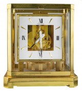 JAEGER LECOULTRE, c1980s, Atmos, mechanical torsion pendulum clock, enamelled dial with Roman numerals, burnished brass case with clear sides, (210mm wide x 230mm high). Very ...