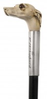 SWAGGER STICK, 19th century, topped with a silver mount and tusk carved hound with inset cabochon eyes, inscribed "To Mr J.R.Sheppard". Very fine.
