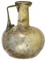 ROMAN, (1st century A.D.), glass jug of squat bulbous form with single broad handle, some irridescence, height 110mm.