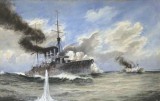 HMAS SYDNEY DESTROYING THE GERMAN CRUISER SMS EMDEN, Nov 9, 1914, watercolour by artist John Downes Castle depicting the first great action of the Royal ...