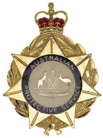 AUSTRALIAN PROTECTIVE SERVICE, flat ID badge type 4 (QC), c1990s-2004, in gilt, enamel and epoxy (49x68mm), by Emblem Supply, with two fold-over pins on reverse ...
