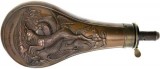 POWDER FLASK, 19th century, in copper with brass pouring spout with 'drams' measurer and external spring operated powder cut off, no maker mark, embossed on ...