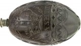 POWDER FLASK, 18th century, British Colonial carved coconut in darkened egg shape, with pewter spout, elaborately hand engraved and featuring George III period British heraldic ...