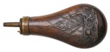 POWDER FLASK, 19th century, in copper with brass pouring spout and external spring operated cut off, embossed on one side with American Civil War commemorative ...