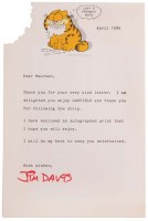 JIM DAVIS, a typed letter signed in red felt tip (approx 14.5x22cm) on a Garfield letterhead, featuring the famed cat with a chunk of paper ...