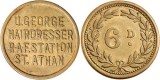 ROYAL AIR FORCE, sixpence in brass (26mm), obverse, 'U.George/Hairdresser/R.A.F.Station/St.Athan', reverse, denomination within wreath; another identical but for eight pence (YMT.RAFT04, 05); (RAF Kirkbridge), twelve MU ...