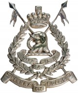 THE VICTORIAN RIFLES, 1900-12, hat badge in silver (44mm), hallmarked by 'F&S' (Fattorini & Sons), details unclear, and a matching pair of collar badges in ...