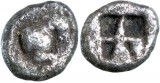 MACEDON, Mende, (c.480-460 B.C.), silver tritartemorion 9mm, (0.31 g), obv. Head of braying ass to left; pellet on neck, M before, rev. incuse square divided ...