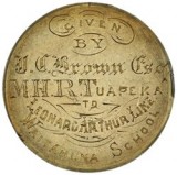 WAITAHUNA SCHOOL, 1878, disc in gold (probably 9ct, 4.6g, 27mm), inscribed on obverse 'Given/By/J.C.Brown Esq./M.H.R.Tuapeka/To/Leonard Arthur Line/Waitahuna School', reverse inscribed 'Annual Prize/For/Regular Attendance/Good Conduct/&/General Improvement/18th ...
