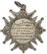 MAUNGAWHAU SCHOOL, fob medal, uniface, struck in silver (27x27mm), no maker, ring top suspension, obverse inscribed 'Jessie Farmer/Maungawhau/School/6 Years/Continuous/Attendance', reverse inscribed 'With the/Compliments/of the/Mt.Eden School/Committee/April ...