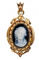 CAMEO LOCKET, 18ct yellow gold locket, beaded suspension bail, set with large carved agate depicting classical female head (22.39g total weight). Small chip on nose ...