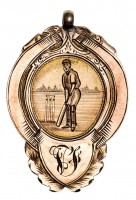 D.F.B. Cricket Club, prize fob in gold (9ct; 2.19g; 23mm), by M (Middlewick), ring top suspension, reverse inscribed, 'D.F.B.C C/Bowling/Won by/C.Martin./1923-4.'. Toned nearly extremely fine.