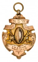 N.S.W. Rugby Football League, prize fob in gold (9ct; 6.61g; 27x35mm), by W.Kerr, ring top suspension, obverse inscribed, 'N S W/Rugby Football/League', reverse inscribed, 'E.S./Dist ...
