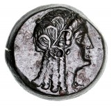 ROMAN REPUBLIC, Lucius Roscius Fabatus, Serrated denarius (c.64 BC), obv. Head of Juno Sospita facing right, wearing goat skin, ROSCI below, rev. female figure facing ...