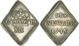 CHARLES I, (1625- 1649), silver sixpence, Newark besieged, 1646 diamond shape, (S.3146, N.2642, Brooker 1228 [same dies]). Light grey tone, nearly very fine and rare ...