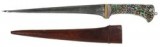 NORTH INDIA, 19th century, dagger scabbard (length 21.5cm), silvered with multi coloured enamelled floral decoration; another dagger scabbard (length 28.5cm), with material cover and plain ...