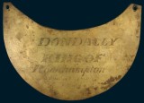 ABORIGINAL BREAST PLATE, 1886, crescent shaped in brass (200x105x3mm), holed at each end for chain suspension, inscribed, 'Dondally/King Of/Rockhampton/Aug. 19th 1886'. Fine.