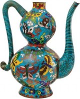 CHINA, 19th - 20th century, cloisonne teapot, of elongated form, double bulbous design, with long spout and handle, decorated with butterflies on a blue background, ...